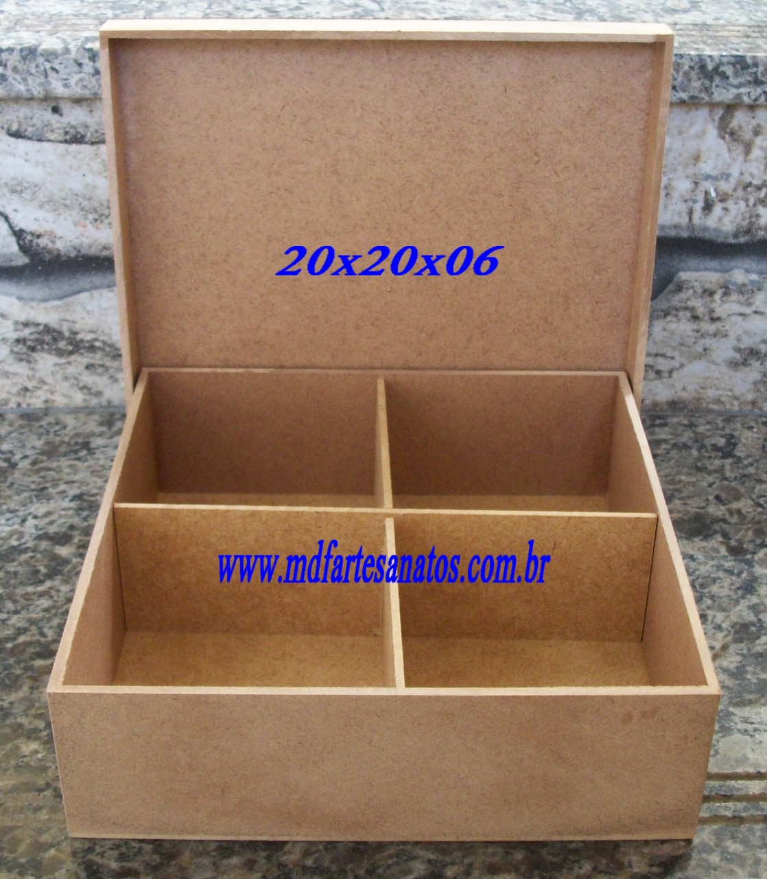 Caixa quadrada 20x20x06 com divisória cruzeta , feita no mdf de 3mm de espessura e com tampa solta tipo caixa de sapato . (( Peça vendida sem pintura ))